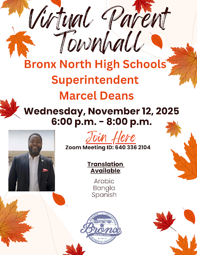 Families of Bronx North High Schools, we are excited to invite you to an important Virtual Parent Townhall with our Superintendent, Marcel Deans.